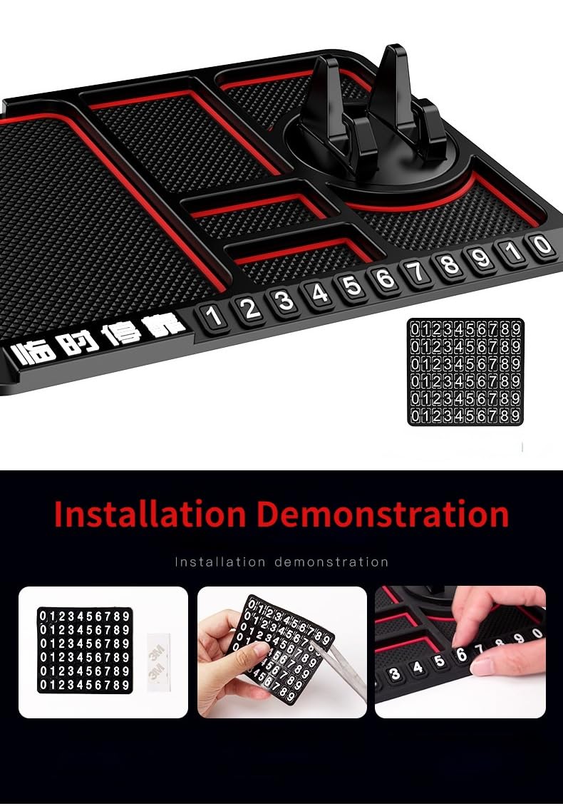 Car dashboard organizer with phone holder and number pad on a car's dashboard.